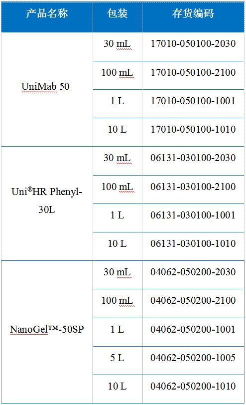 經(jīng)過第一步UniMab® 50 進(jìn)行捕獲,純度提高到 80% 以上,ProA 脫落小于10 ppm 、HCP殘留小于1000 ppm ;Uni®HR Phenyl-30L進(jìn)一步去除降解片段、錯(cuò)配抗體、ProA 脫落、HCP殘留;NanoGel™- 50SP精純后,ProA 脫落小于1 ppm , HCP殘留小于50 ppm,純度大于95%,符合抗體藥物殘留標(biāo)準(zhǔn)。