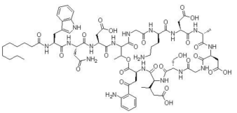 達(dá)托霉素(Daptomycin)是一種新型環(huán)脂肽類抗生素,被譽(yù)為“超級(jí)抗生素”。它是由玫瑰孢鏈霉菌(Streptomyces roseosporus)發(fā)酵獲得。作為一種酸性環(huán)酯肽類化合物,達(dá)托霉素具有新型的化學(xué)結(jié)構(gòu),它由13個(gè)氨基酸組成,其中10個(gè)氨基酸排列成環(huán),3個(gè)氨基酸排列成線狀,其末端的L-Trp接著一個(gè)十碳癸酸。